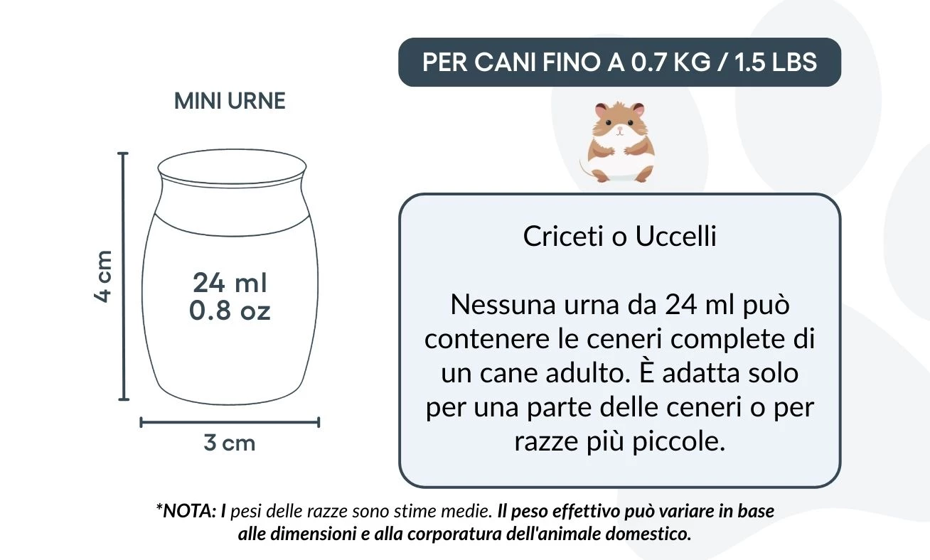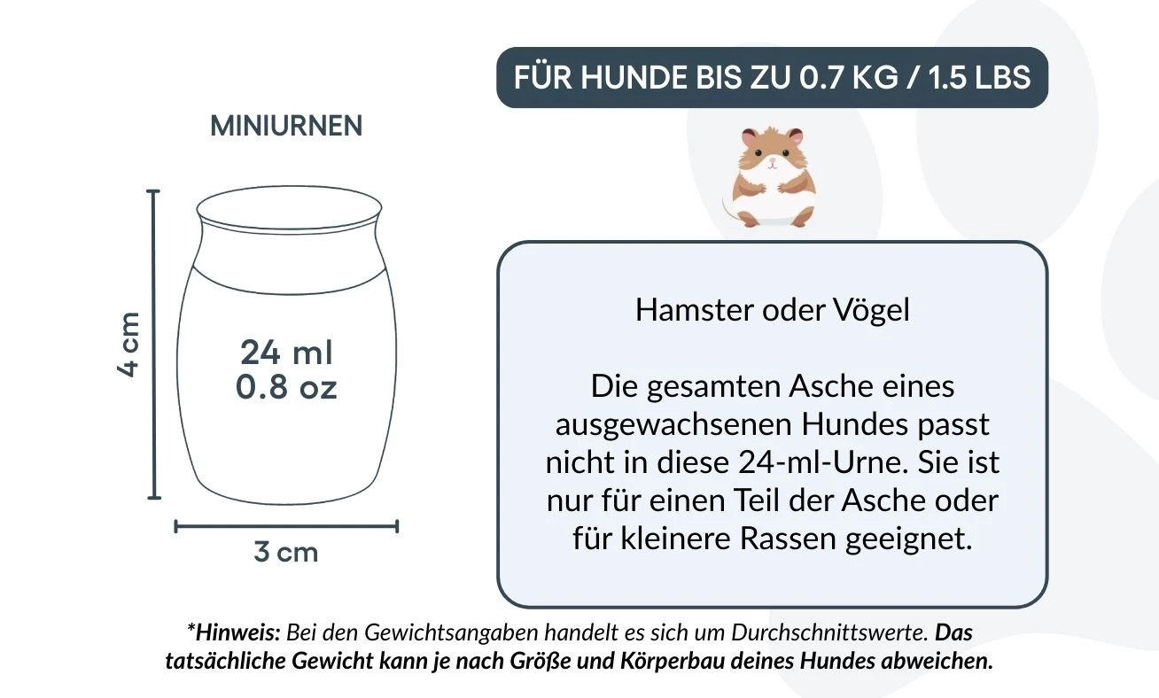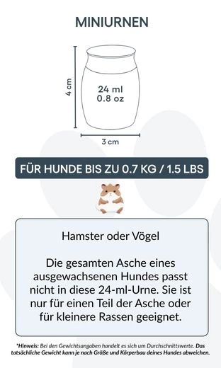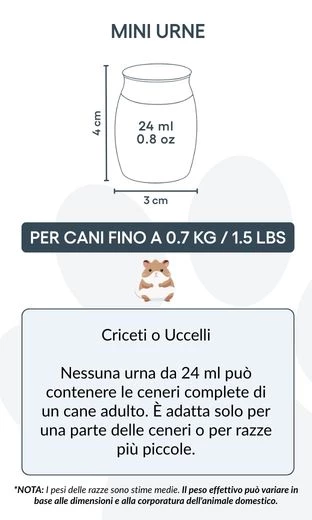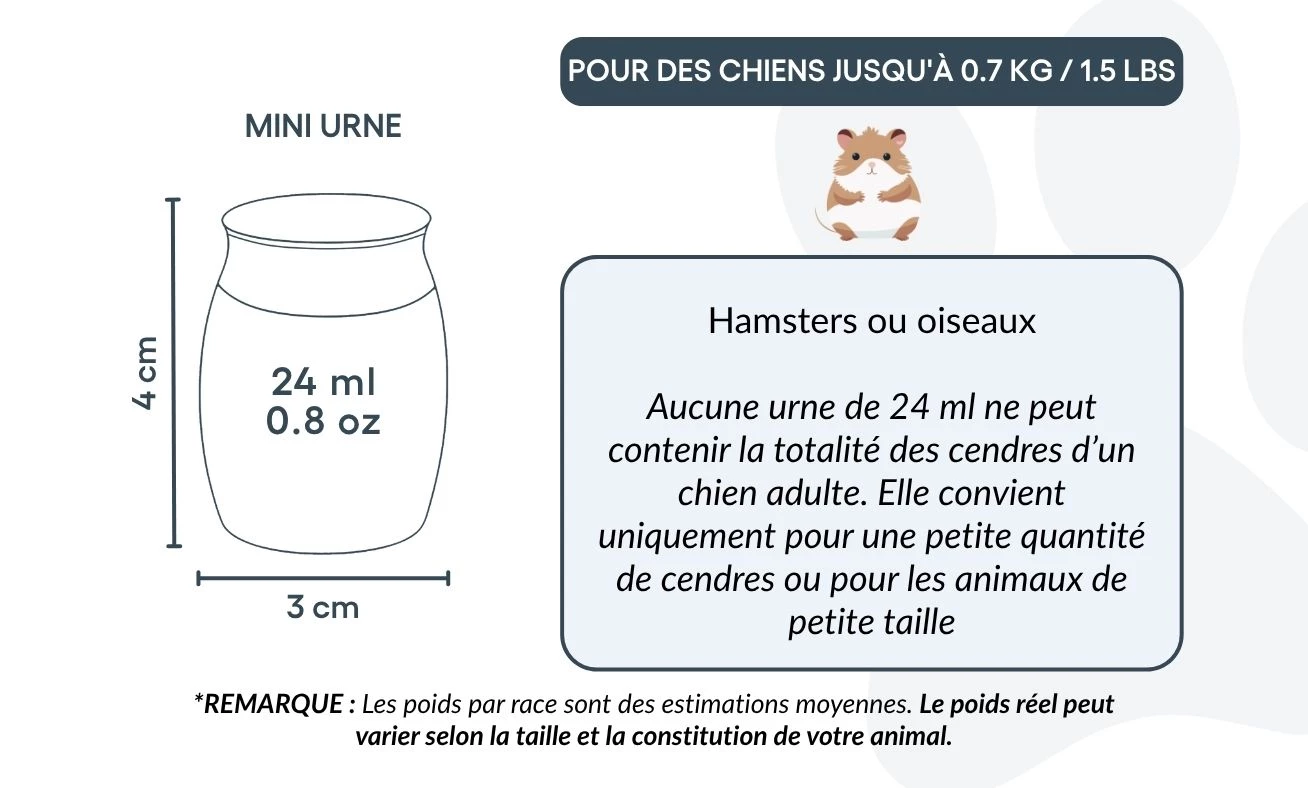 Convient pour : hamsters, petits oiseaux, ou une partie des cendres d’un chien de plus grande taille