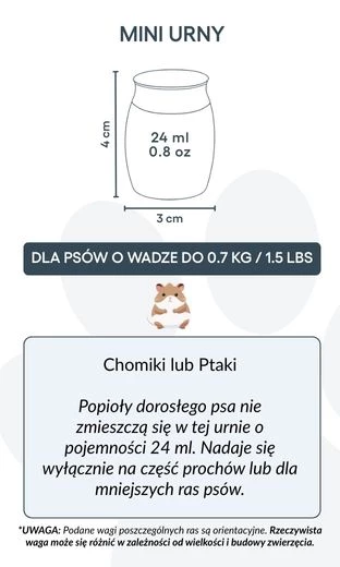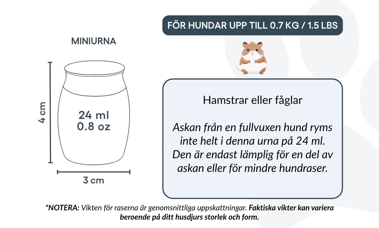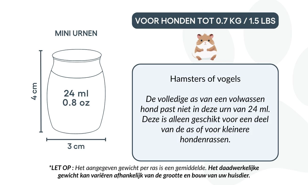 Convient pour : hamsters, petits oiseaux, ou une partie des cendres d’un chien de plus grande taille