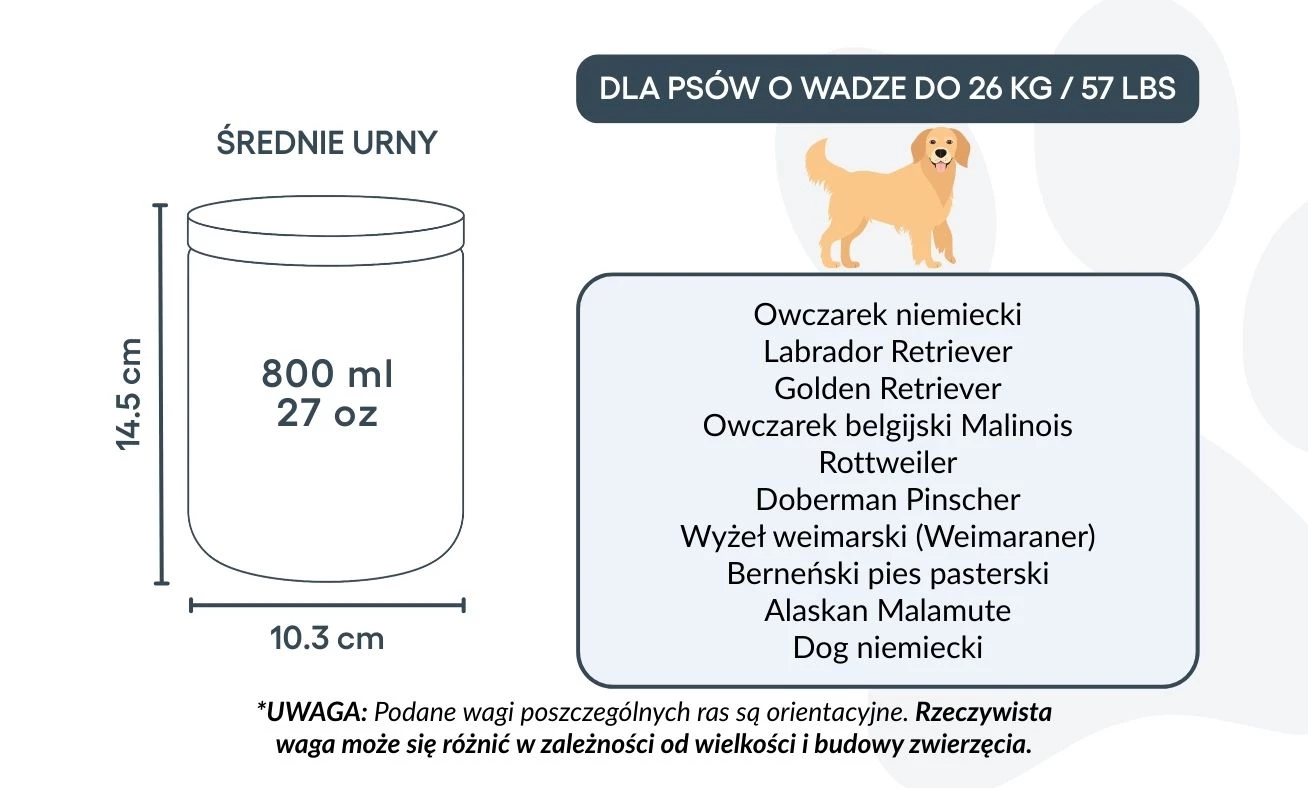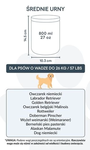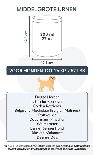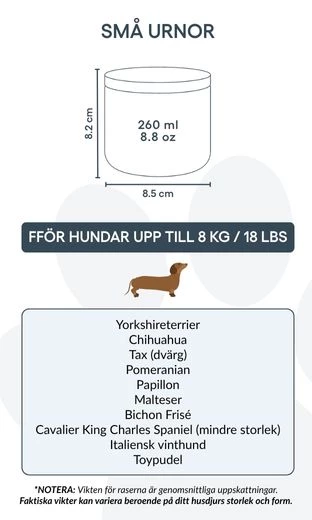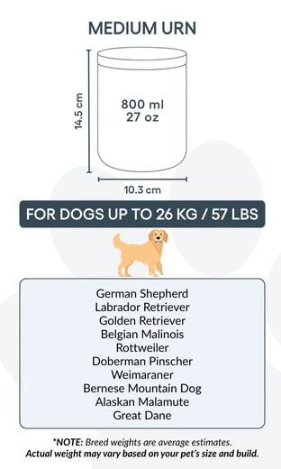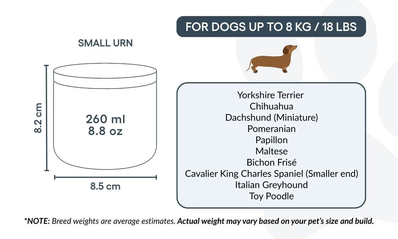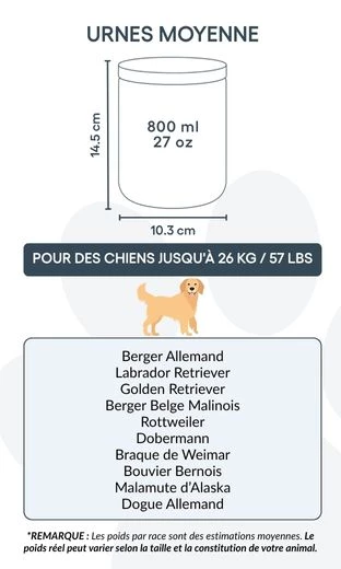 Vous pouvez y ajouter le nom et les dates de vie de votre chien pour en faire un souvenir profondément personnel. Disponible en deux tailles, cette urne funéraire pour animaux convient aussi bien aux petits qu’aux moyens chiens.