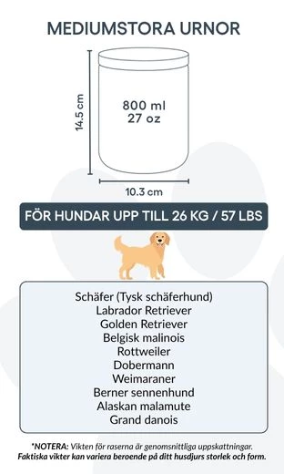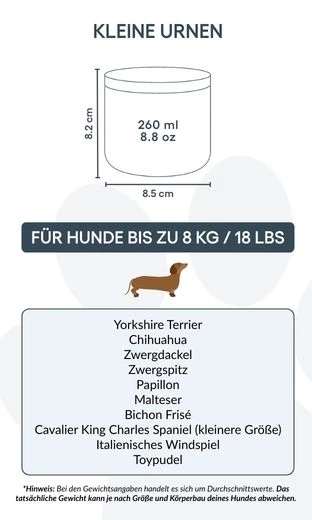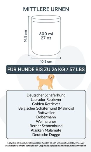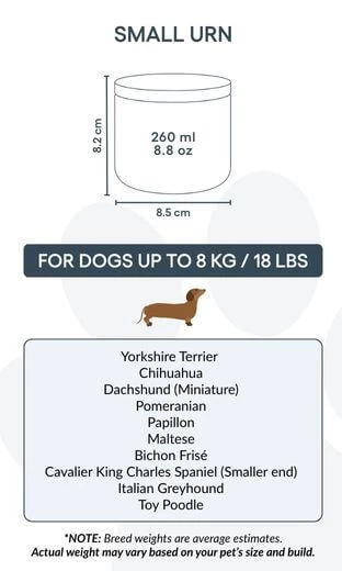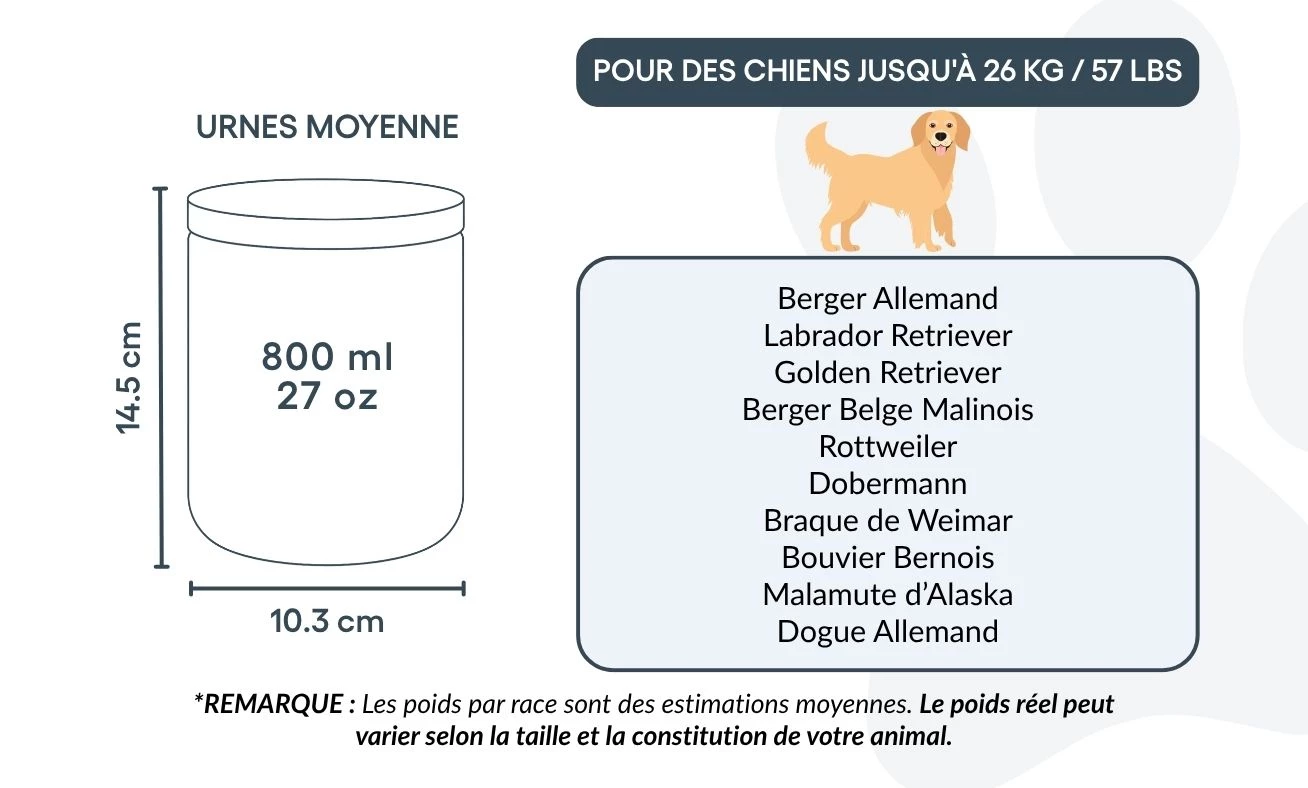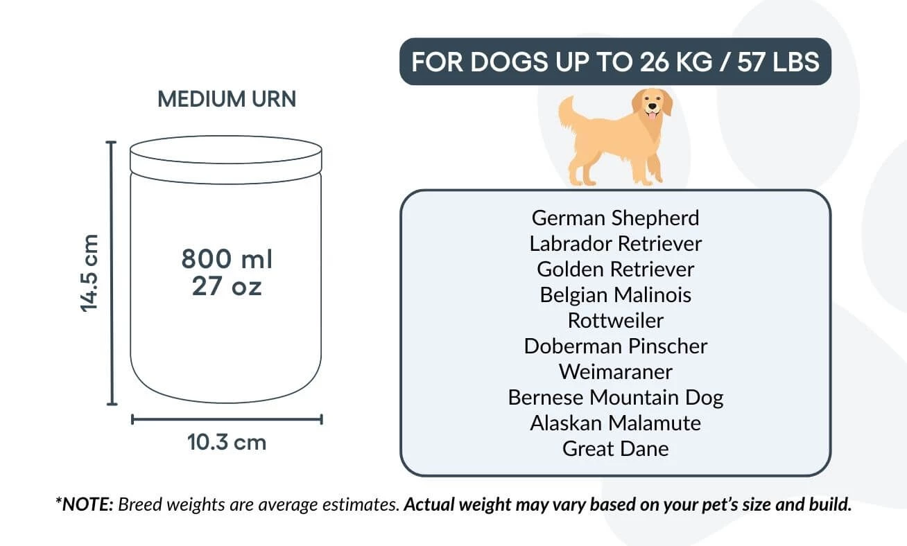 Conçue pour honorer votre animal de compagnie avec simplicité et respect, cette urne de crémation pour animaux est disponible en deux tailles, adaptées aux petits et moyens chiens. Placée sur une étagère, une table ou dans un coin de recueillement, elle constitue un souvenir apaisant et intemporel du lien unique que vous avez partagé.
