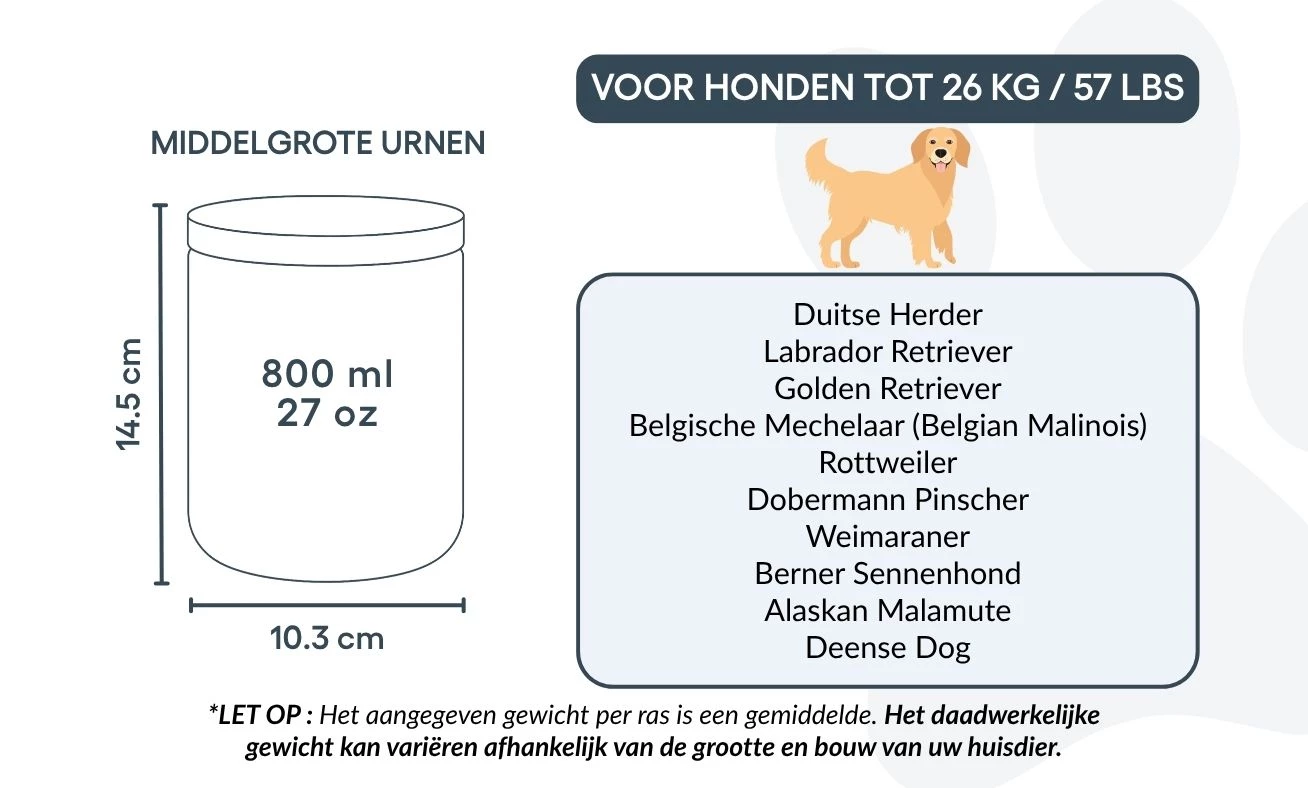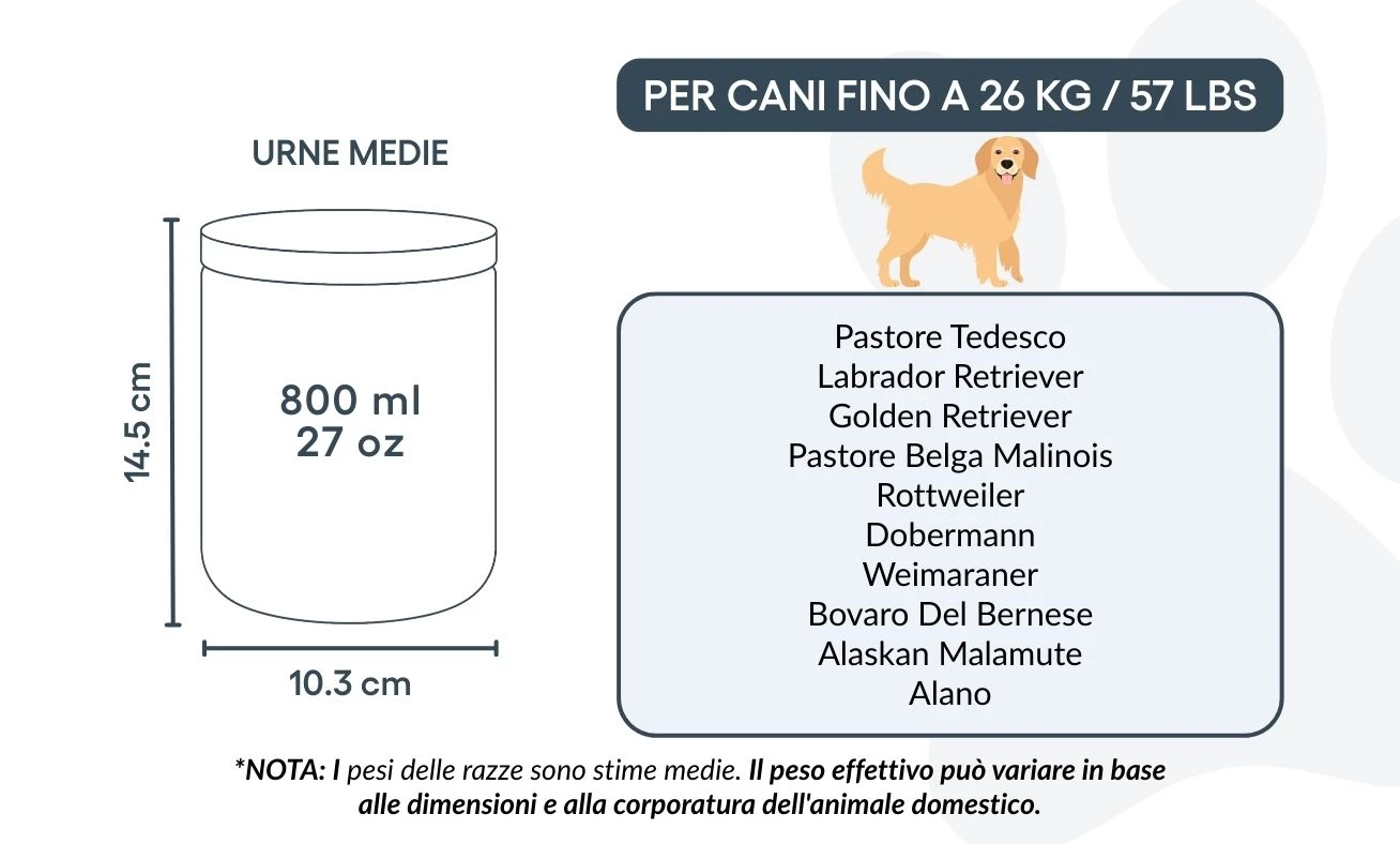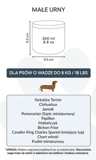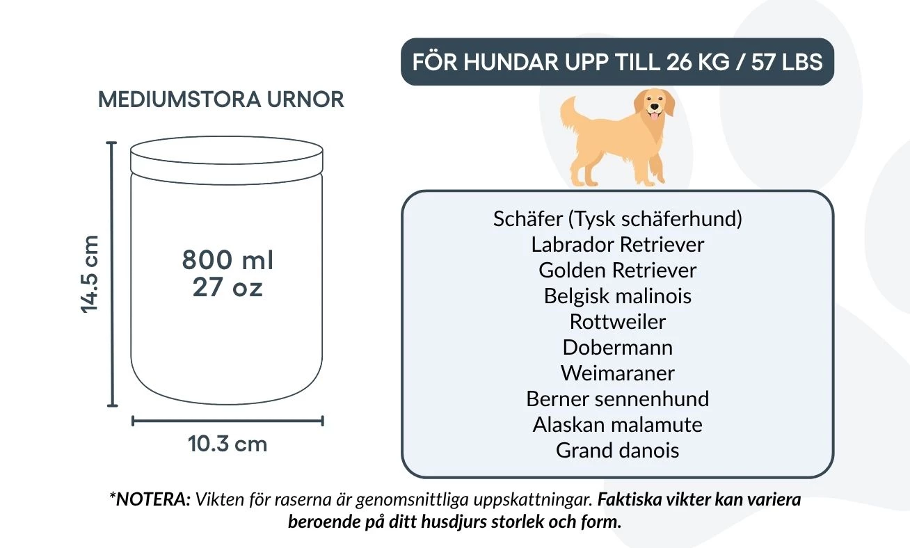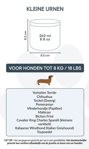 Disponible en deux tailles pour convenir aux petits et moyens chiens, cette urne de crémation est une façon respectueuse et personnelle de dire adieu à votre compagnon. Plus qu’un simple objet, c’est un souvenir durable, conçu pour honorer la fidélité, la tendresse et l’amour partagé.