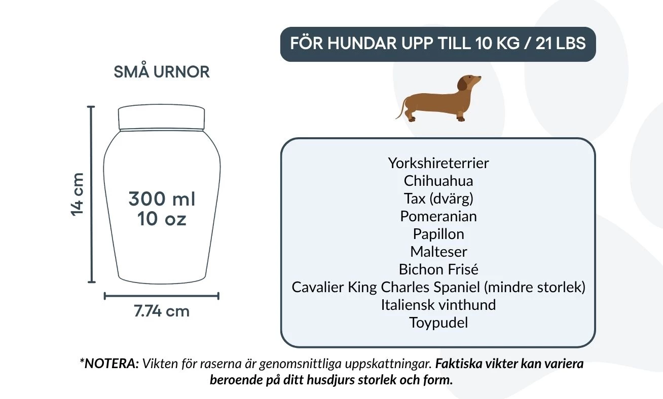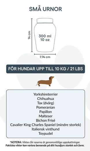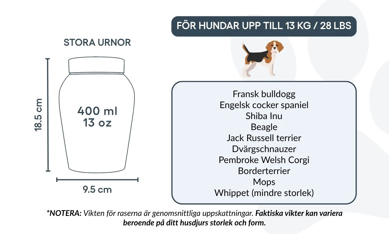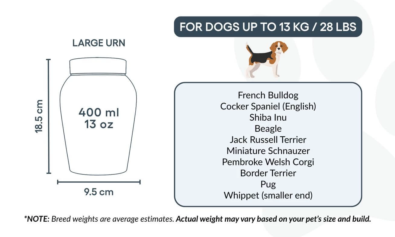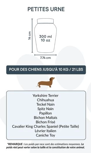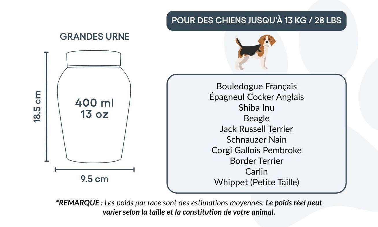 Avec son couvercle sécurisé et sa finition polie, cette urne funéraire est idéale pour conserver les cendres avec respect et sérénité. Proposée en deux tailles, elle constitue un repos digne et personnalisé pour les petits et moyens chiens, tout en restant un souvenir précieux de votre fidèle ami.