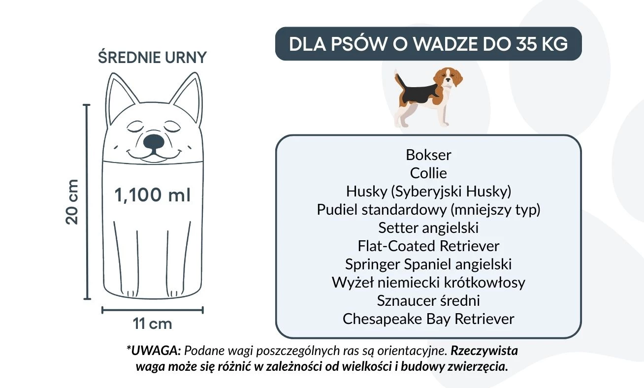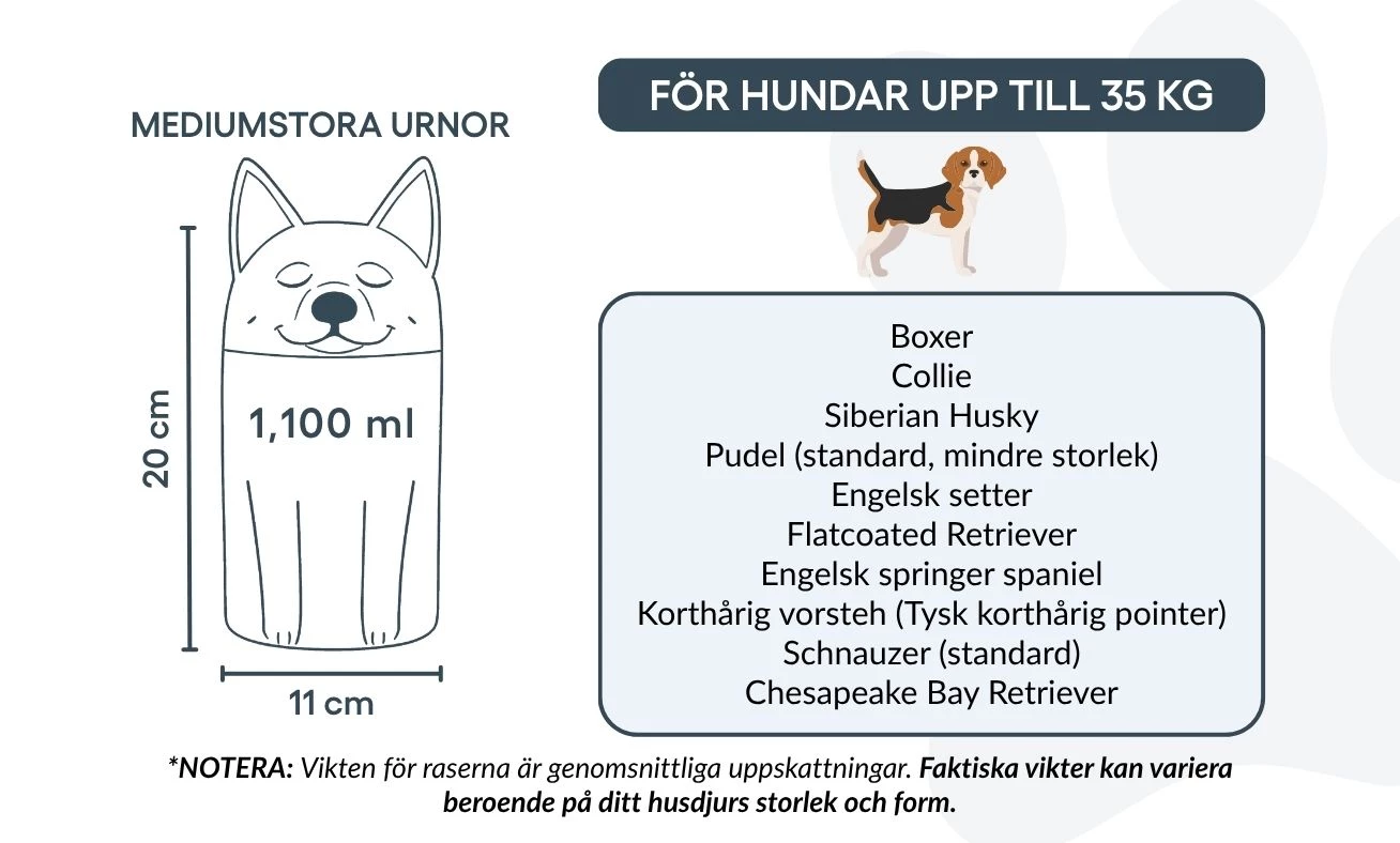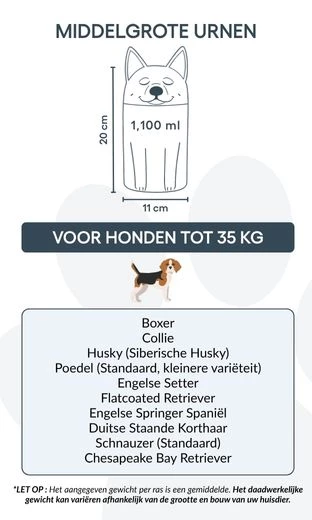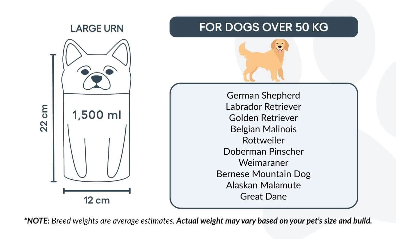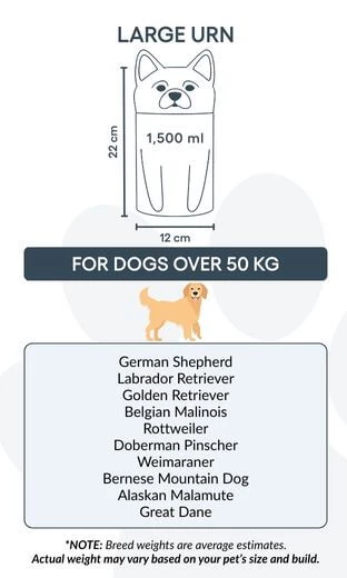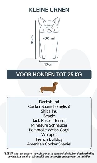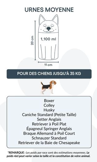 Remarque : les volumes indiqués sont basés sur des estimations moyennes de crémation. Pensez au poids et à la morphologie de votre animal avant de choisir la taille.