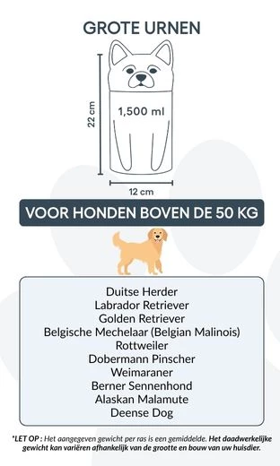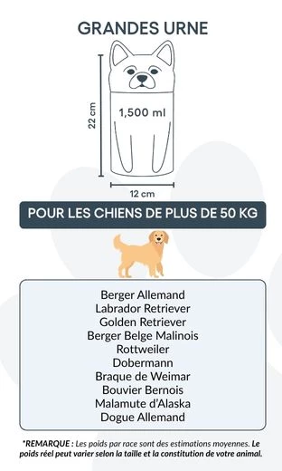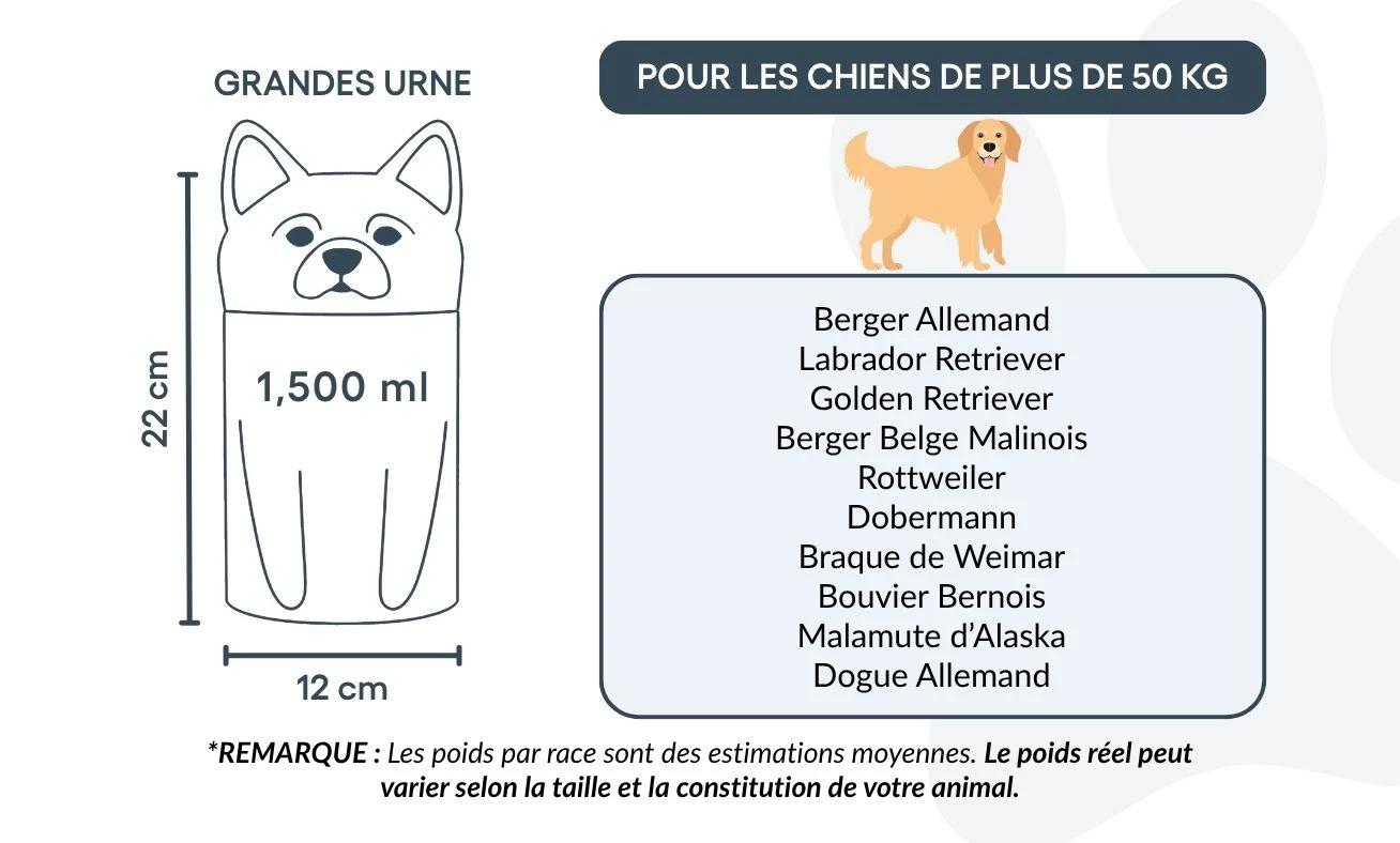 Remarque : les volumes indiqués sont des estimations moyennes basées sur le poids après crémation. Veuillez prendre en compte le poids et la morphologie de votre animal avant de choisir la taille.