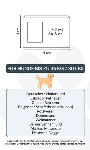 Races généralement compatibles : Beagle, Cocker Spaniel, Bouledogue Français, Schnauzer Nain, Carlin, Shih Tzu, Cavalier King Charles Spaniel Convient également à une partie des cendres de grands chiens tels que : Labrador Retriever, Golden Retriever, Berger Allemand, Boxer, Border Collie, Husky, Staffordshire Bull Terrier, Rottweiler