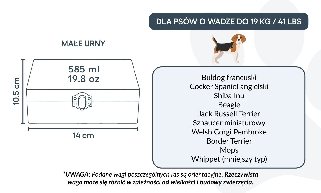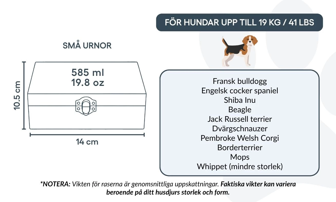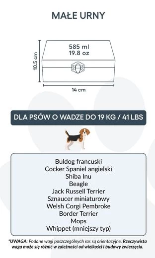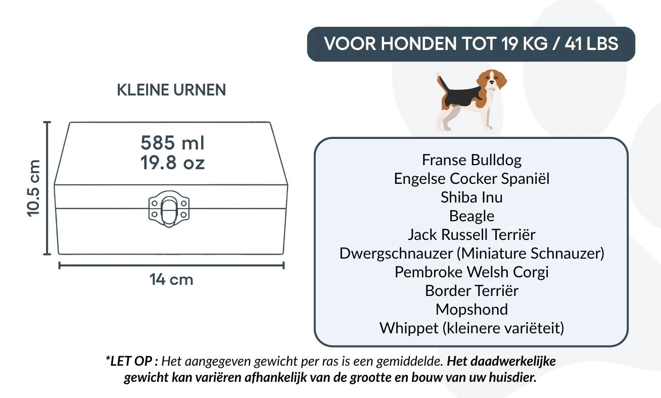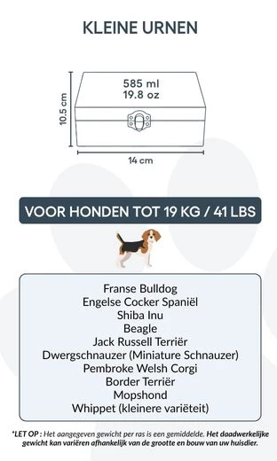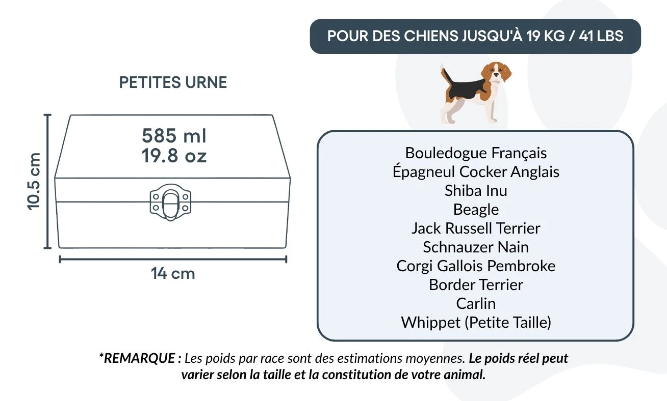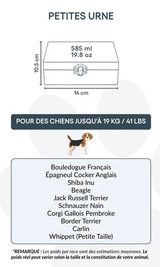 Convient pour les chiens jusqu’à 19 kg / 41 lb, ou pour une partie des cendres d’un chien plus grand.